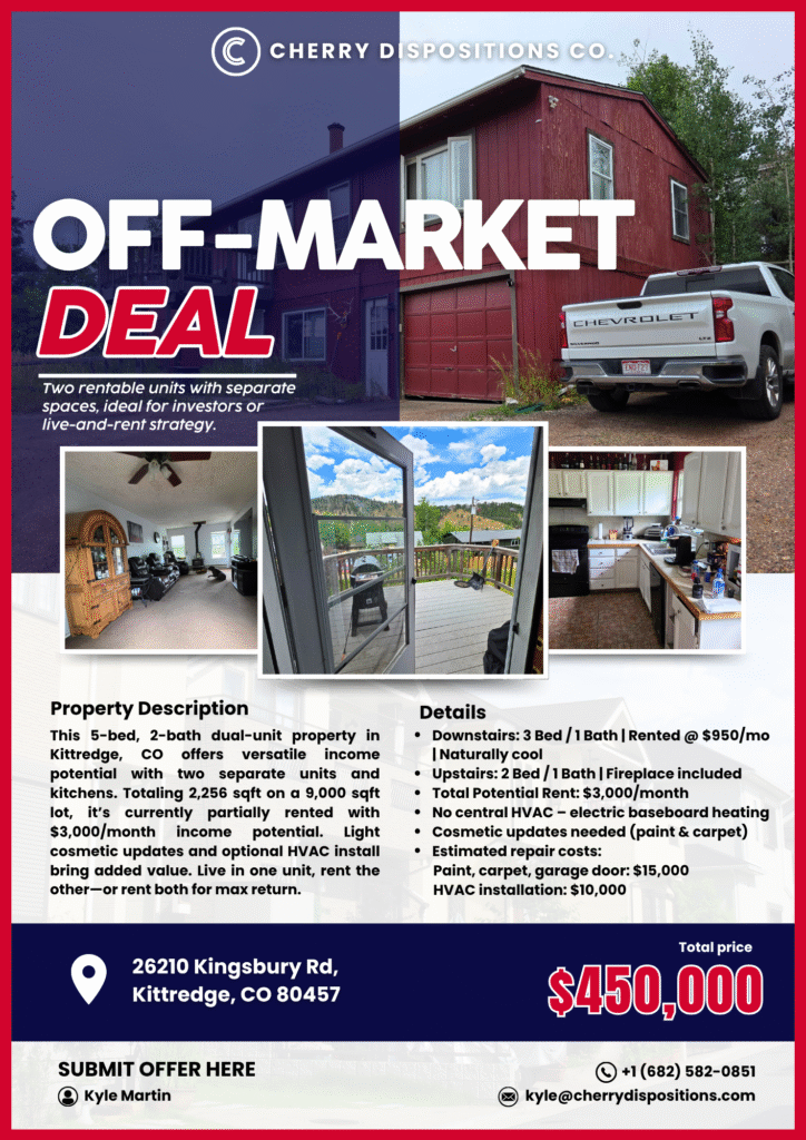 #ColoradoRealEstate #KittredgeCO #IncomeProperty #DuplexStyle #RealEstateInvestor #OffMarketDeal #BuyAndHold #FixAndRent